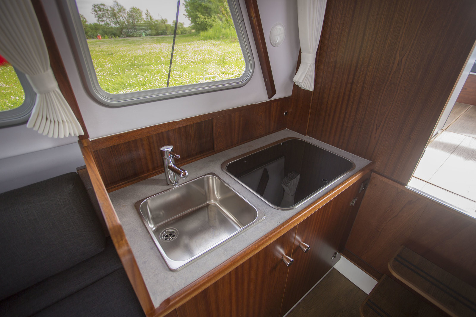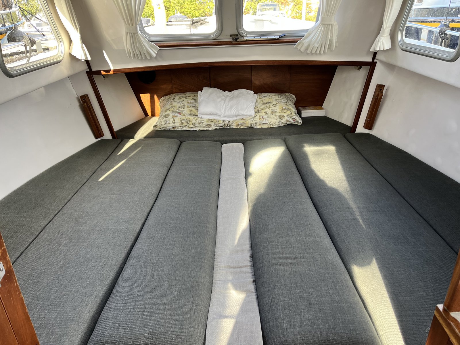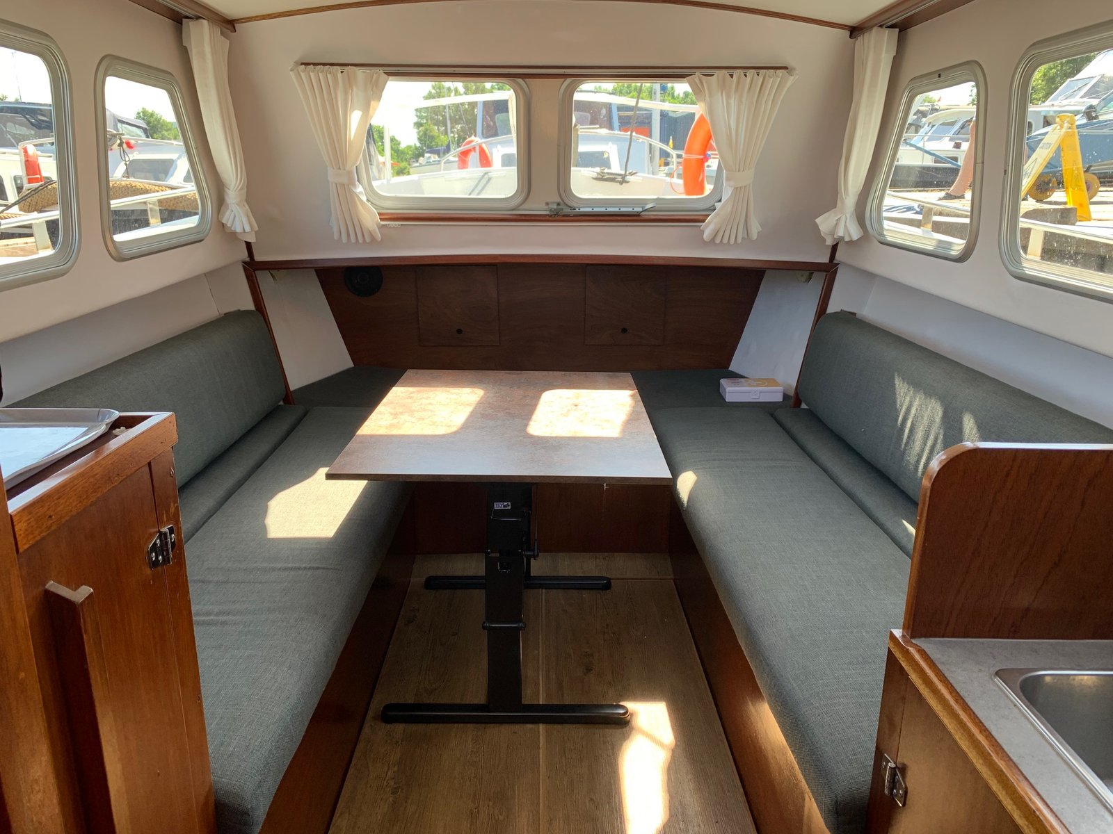 Aan de voorzijde van het schip vind je een comfortabele zithoek, een praktisch ingerichte keuken en een aparte toiletruimte. De zitbanken en tafel zijn eenvoudig om te bouwen tot een royaal tweepersoonsbed. De keuken beschikt over een 3-pits gasfornuis, complete keukeninventaris en een roestvrijstalen spoelbak. Onder de zitplaatsen is extra bergruimte aanwezig voor bagage en proviand.