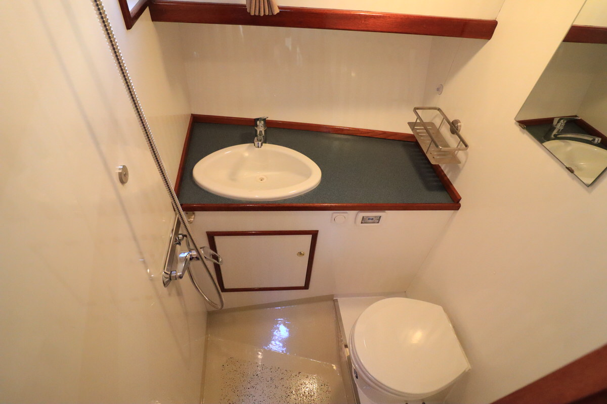 In het achterschip is ook een afgesloten slaapcabine met half vrijstaand 2-persoonsbed met lattenbodem, een toiletruimte met elektrisch toilet en wastafel en een separate douche.