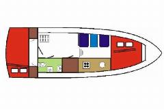 De slaapplaats in de punt is niet afsluitbaar. Achterin het schip bevindt zich wel een afsluitbare slaapcabine. Er is een sanitaire ruimte aanwezig met een douche, toilet en wasbakje.