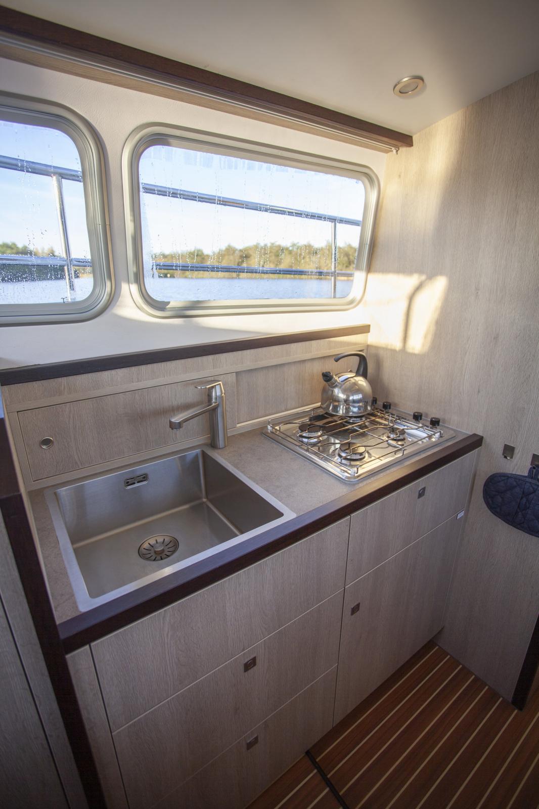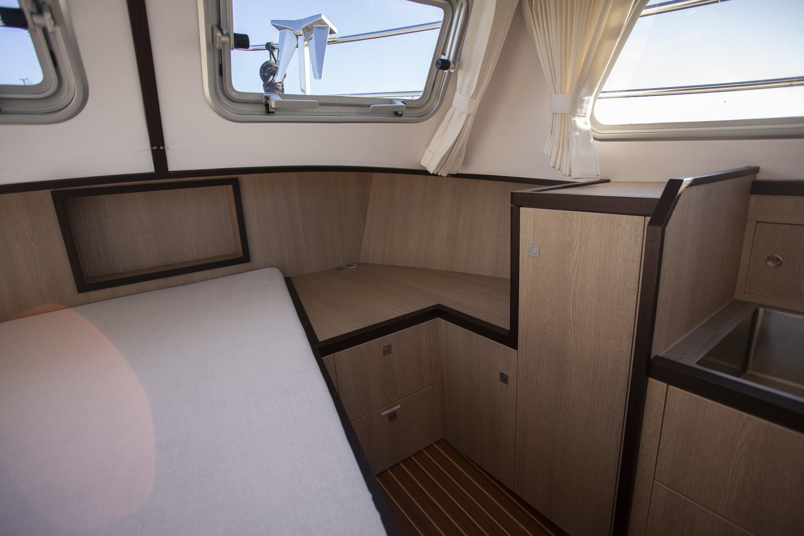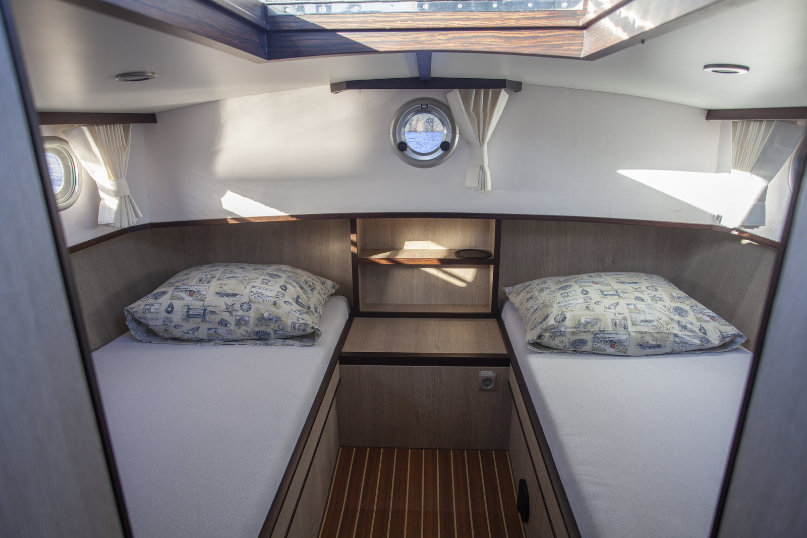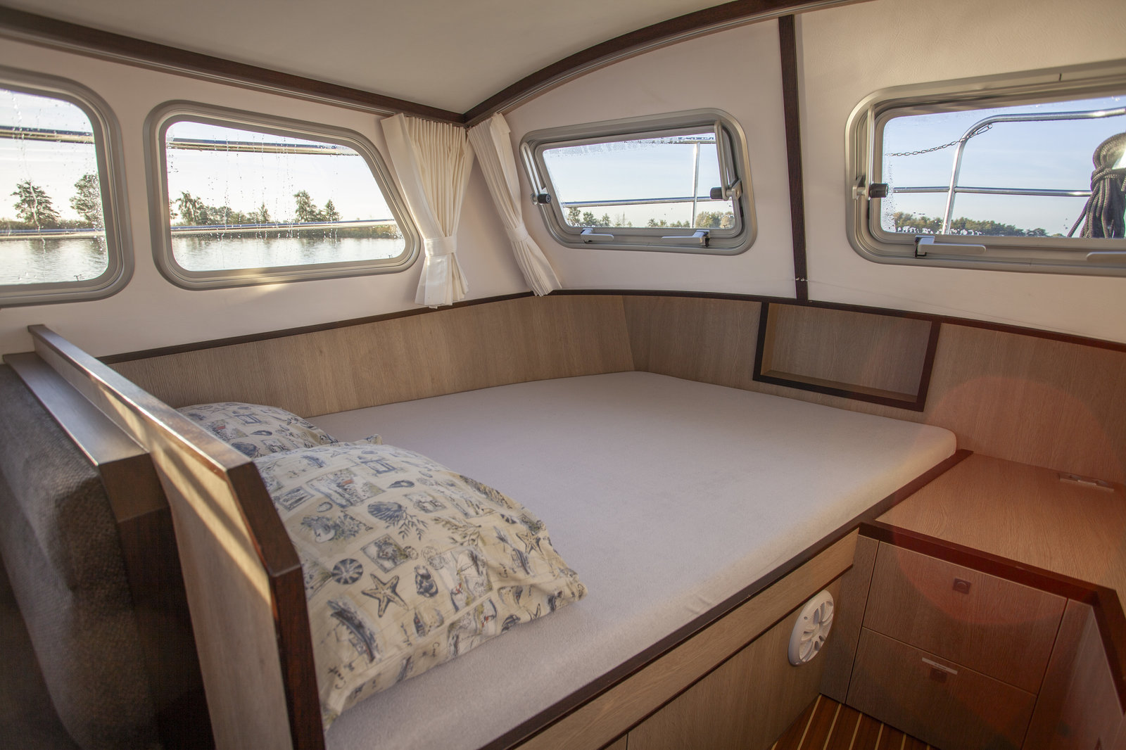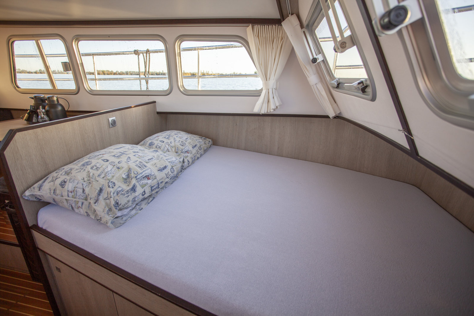Aan de voorzijde van de boot bevindt zich een ruim vast tweepersoonsbed, een praktische keuken, een toilet met douche en een gezellige eethoek. Achterin vind je een aparte slaaphut met twee vaste slaapplaatsen. Bij mooi weer kan de cabrioletkap gedeeltelijk of volledig worden geopend, zodat je volop van het buitenleven kunt genieten.