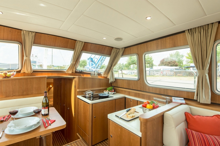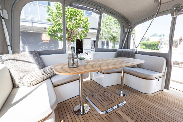 Het interieur kenmerkt zich door een uitgekiende indeling gemaakt van kersenhout en luxe materialen zoals Corian bladen en leder in een lichte smaakvolle kleurstelling. Tegenover de keuken is een mooie eethoek (dinette) met veel lichtinval. Aan boord is een Nespresso apparaat aanwezig. Het jacht beschikt over een zeer ruime en lichte salon en biedt plaats aan 6 personen. In de salon is een televisie met satellietontvangst. Het achterdek wordt uitgevoerd in echt teakhout, wat het jacht luxe nautische allure geeft. Aan dek is ruim zitplaats op de vaste banken met fijne kussens en het achterdek is rondom de bank geheel afsluitbaar met een extra grote cabriotent. Bij de stuurstand is een warme lucht uitloop.