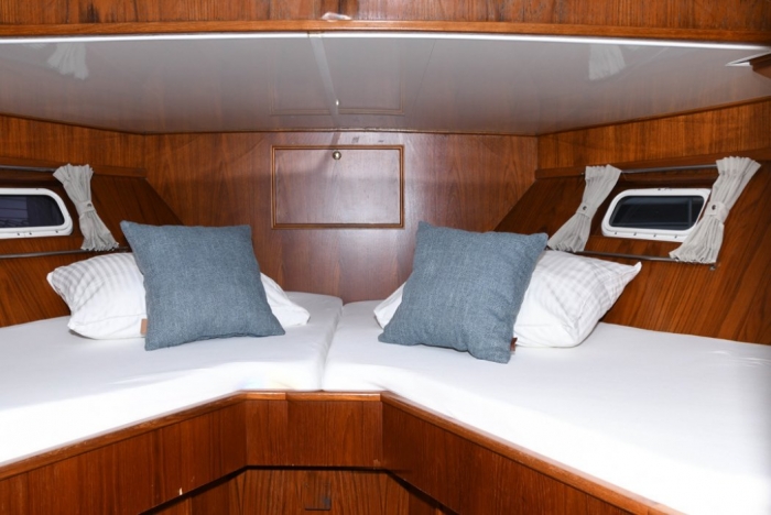 Dit is een groot jacht met slaapplaats voor maximaal 6 personen. De boot beschikt over een douche en heeft twee toiletten aan boord. Het jacht is ideaal voor bijvoorbeeld gezinnen met kinderen. In de voorste slaapcabine zijn twee eenpersoonsbedden. Achterin het schip bevinden zich twee slaapcabines waarvan eentje een stapelbed heeft en de ander een tweepersoonsbed. De optimale wendbaarheid van het schip wordt geregeld door de boeg- en hekschroef.