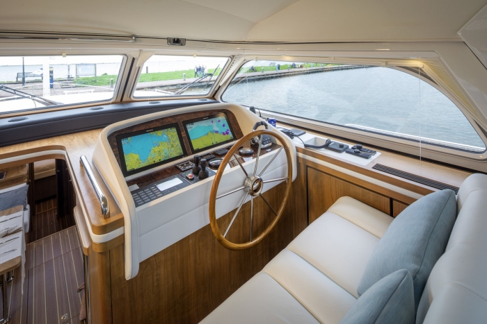 Deze prachtige Linssen beschikt over een zeer chique uitstraling. De boot beschikt over alle denkbare luxe en comfort. Het jacht is geschikt voor maximaal 6 personen. Het dashboard in de stuurhut is voorzien van alle denkbare navigatietools en de boot beschikt over een set stabilisatoren waardoor ieder vaargebied technisch mogelijk is voor deze stoere Linssen. De Variotop bevindt zich boven de stuurband welke elektrisch te bedienen is. In de stuurhut is ruim zitplaats en tevens is daar een klein keukentje met een extra koelkast. Dit gedeelte is geheel afsluitbaar met solide deuren en verwarmbaar.