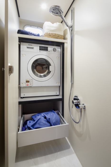 Wat ook zeer uniek is aan deze boot, dat u een complete wasruimte aan boord heeft met was- en droogmachine. Door de zware generator zijn al deze zaken op elke locatie te gebruiken.